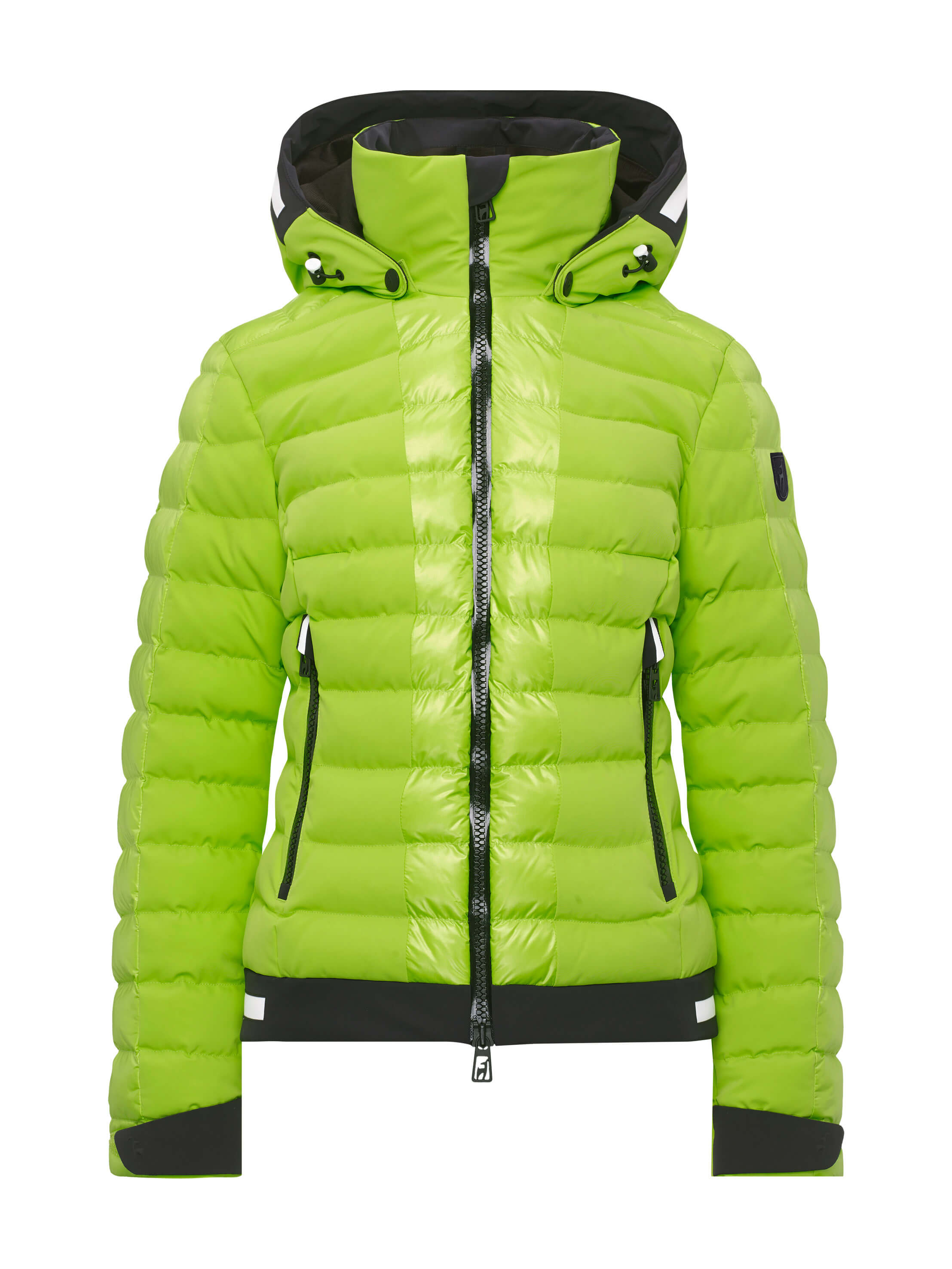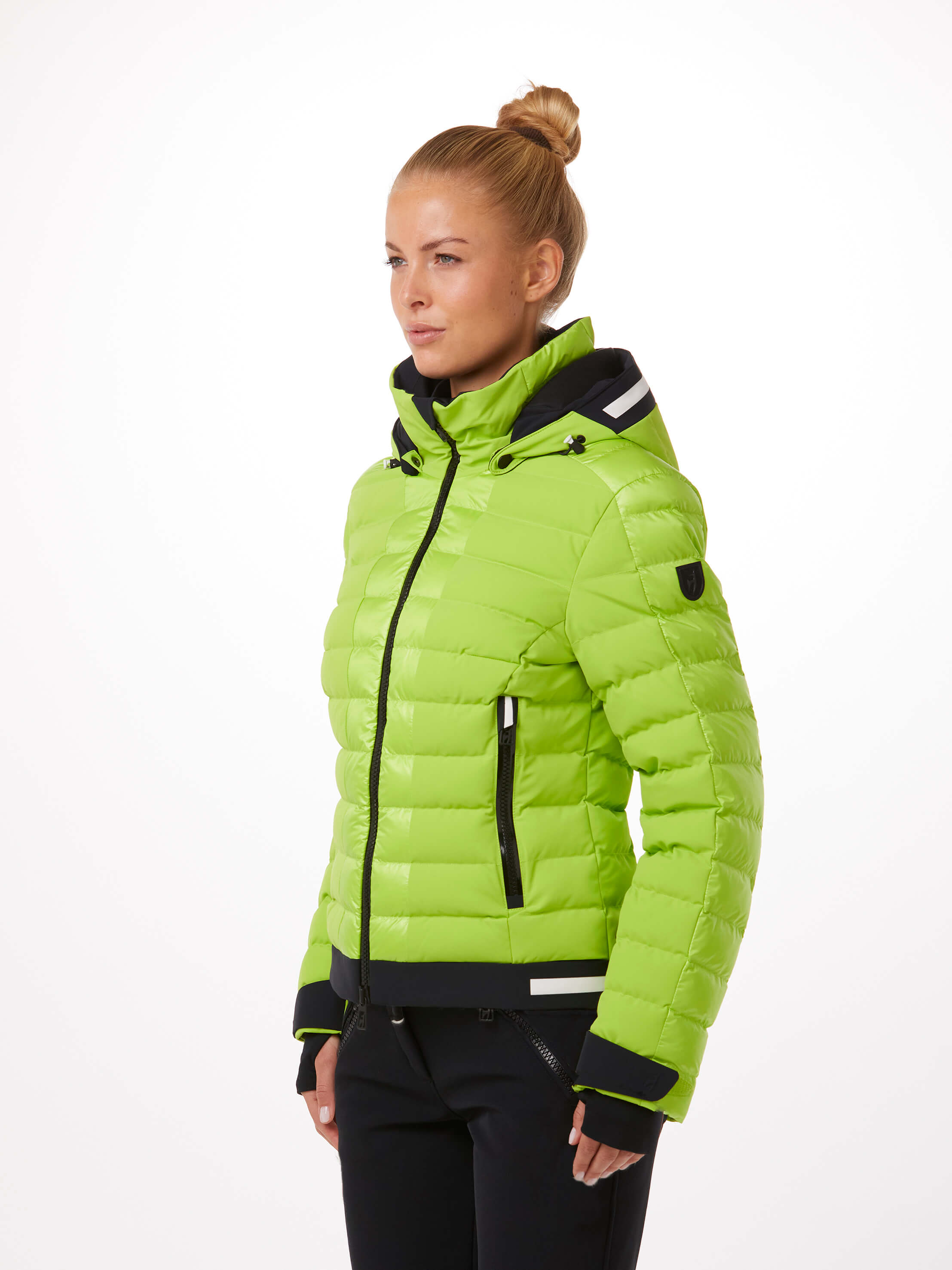 The NORMA women’s ski jacket, manually filled with heat-retaining SORONA® Fiberballs, combines a sporty look with a feminine silhouette. High functionality in all weather conditions is ensured with Japanese Premium 4-wayStretch and Shiny Nylon Ripstop Cire finish with a membrane, Z-Liner, and water-repellent finish. Each design element is perfectly coordinated for exceptional comfort. With super soft fleece lining inside the collar for a luxurious feel and the Toni Sailer logo at the back hem.