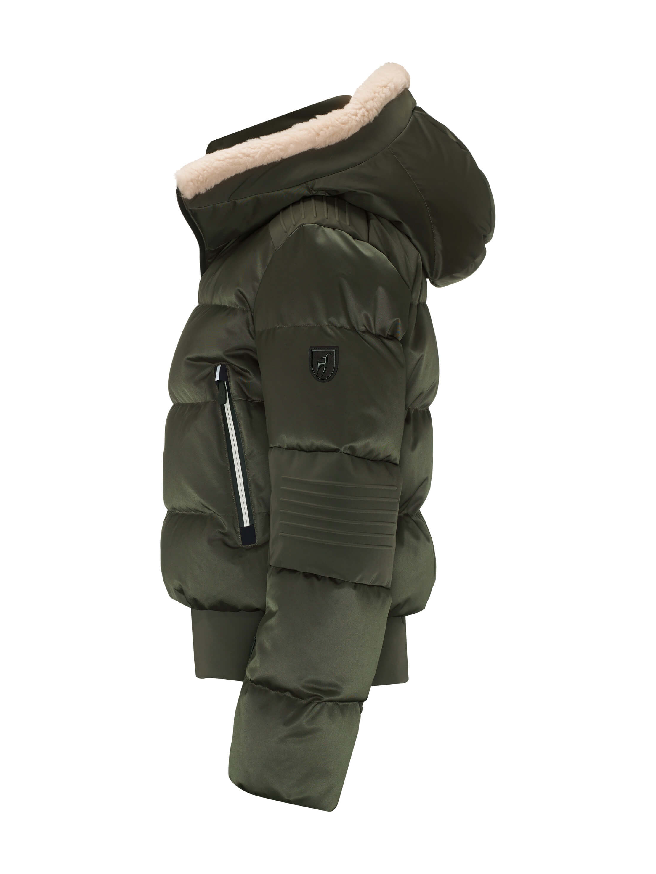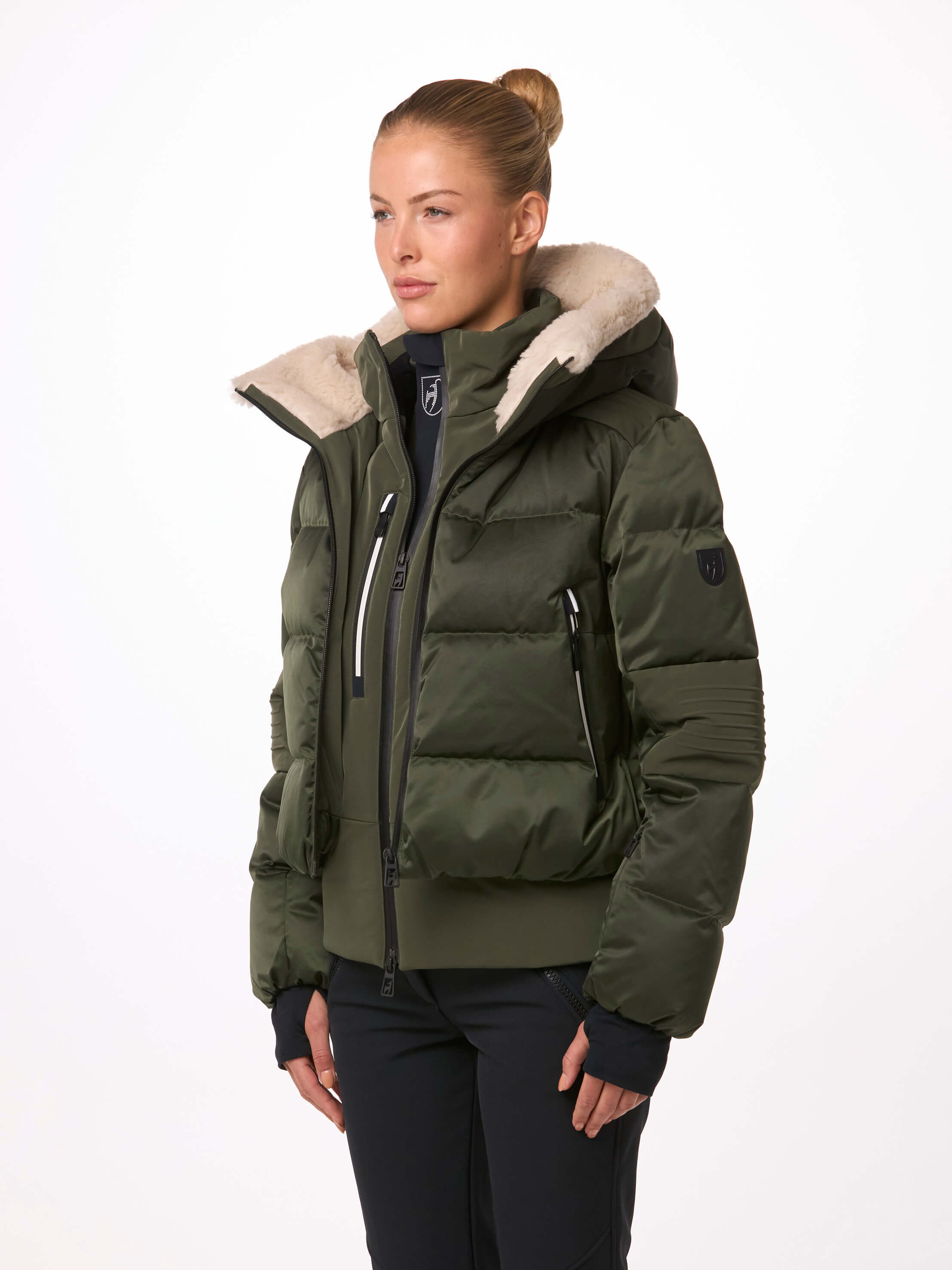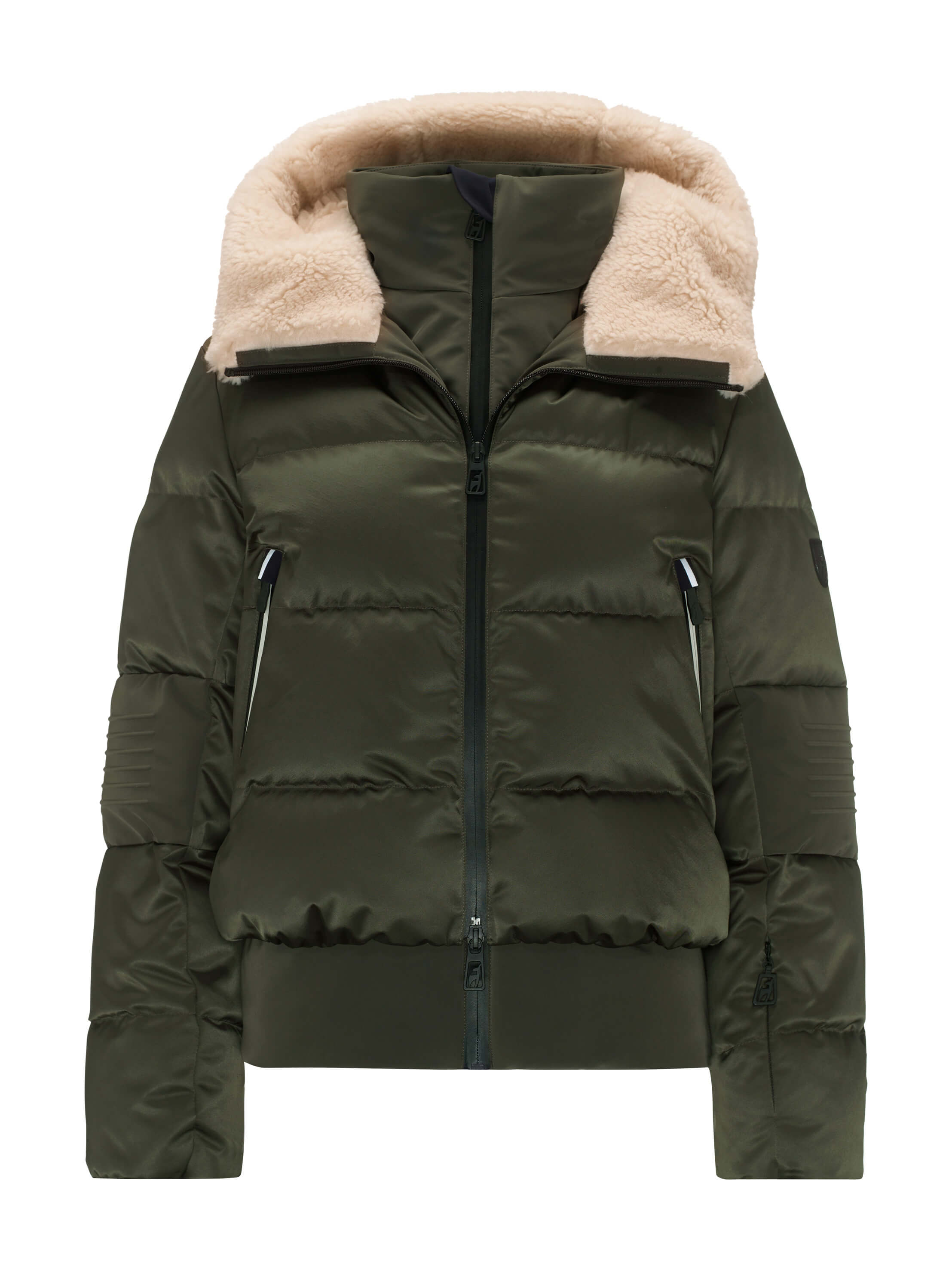 Slopes meets cities! The luxury SASHA jacket is a new satin puffer 2 in 1 look jacket with such a cozy teddy pile collar to keep you warm and comfortable. Certified down with 750 cuin fill power keeps you warm in the snow and on stormy streets. Tech zips show the perfect combination between Fashion X Function.