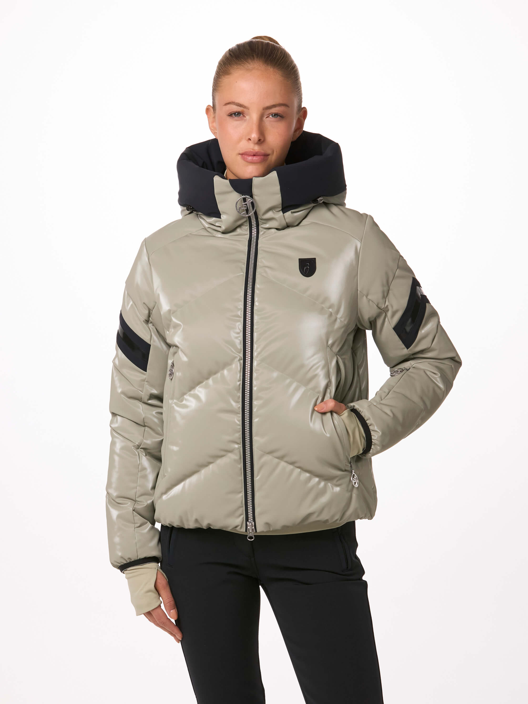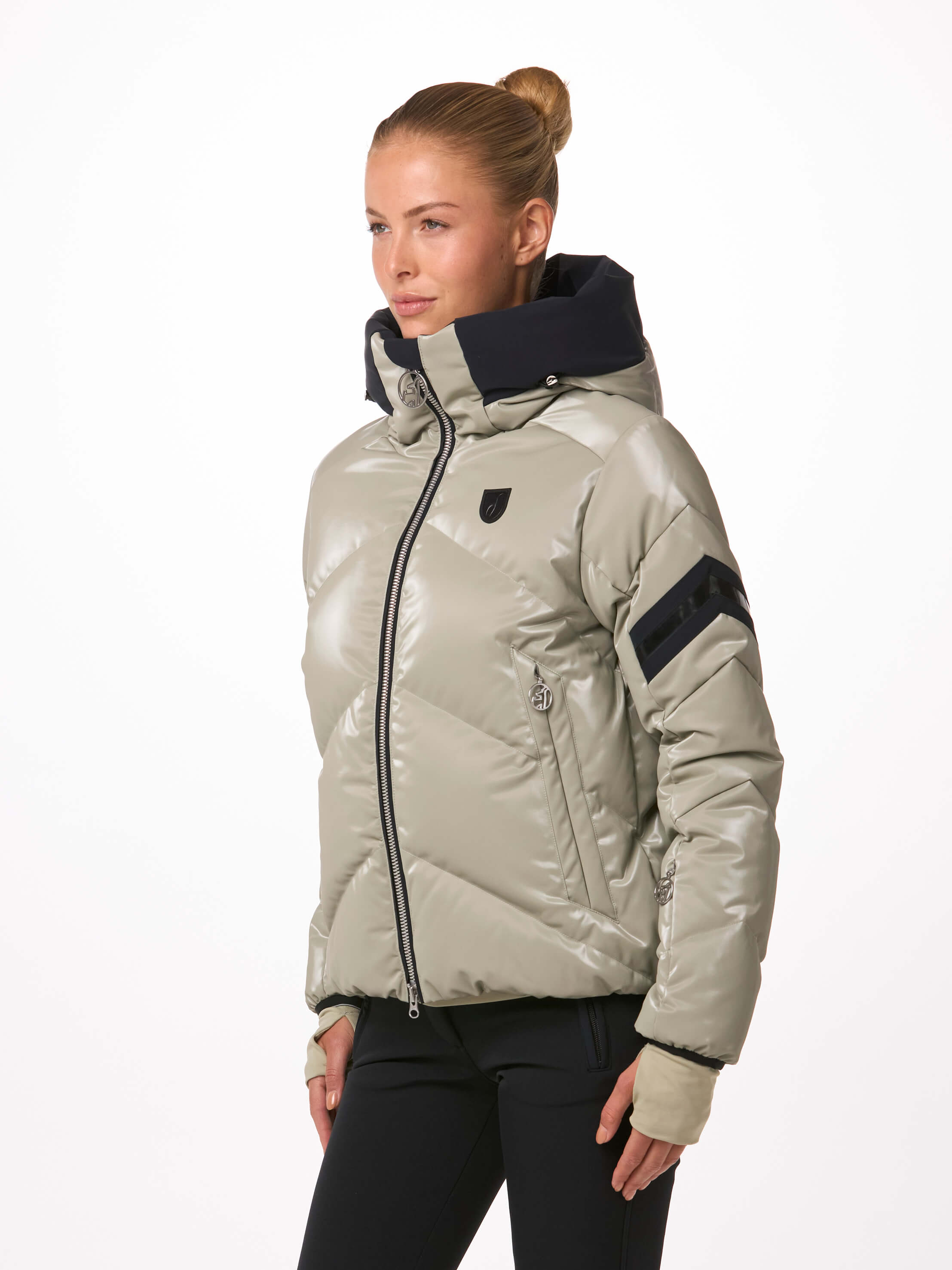 Un stretch luxueux et scintillant ! La HELENA GLIMMER est notre prochaine édition spéciale fabriquée dans un tissu très limité. Elle souligne l'ADN de Toni Sailer : la mode rencontre la fonction ! Des détails noirs brillants et de nouveaux logos 3D en relief sur la capuche complètent ce style moderne.