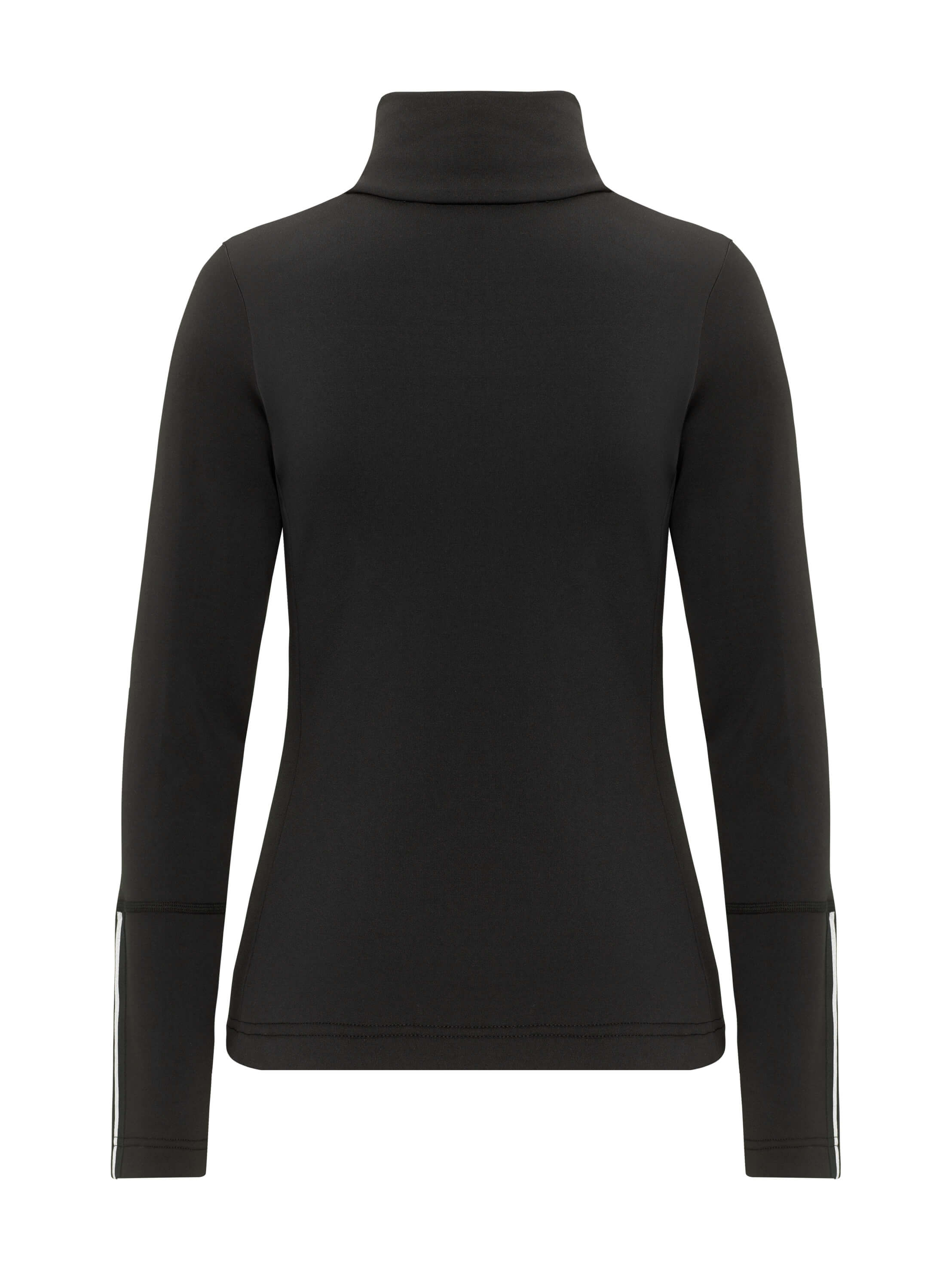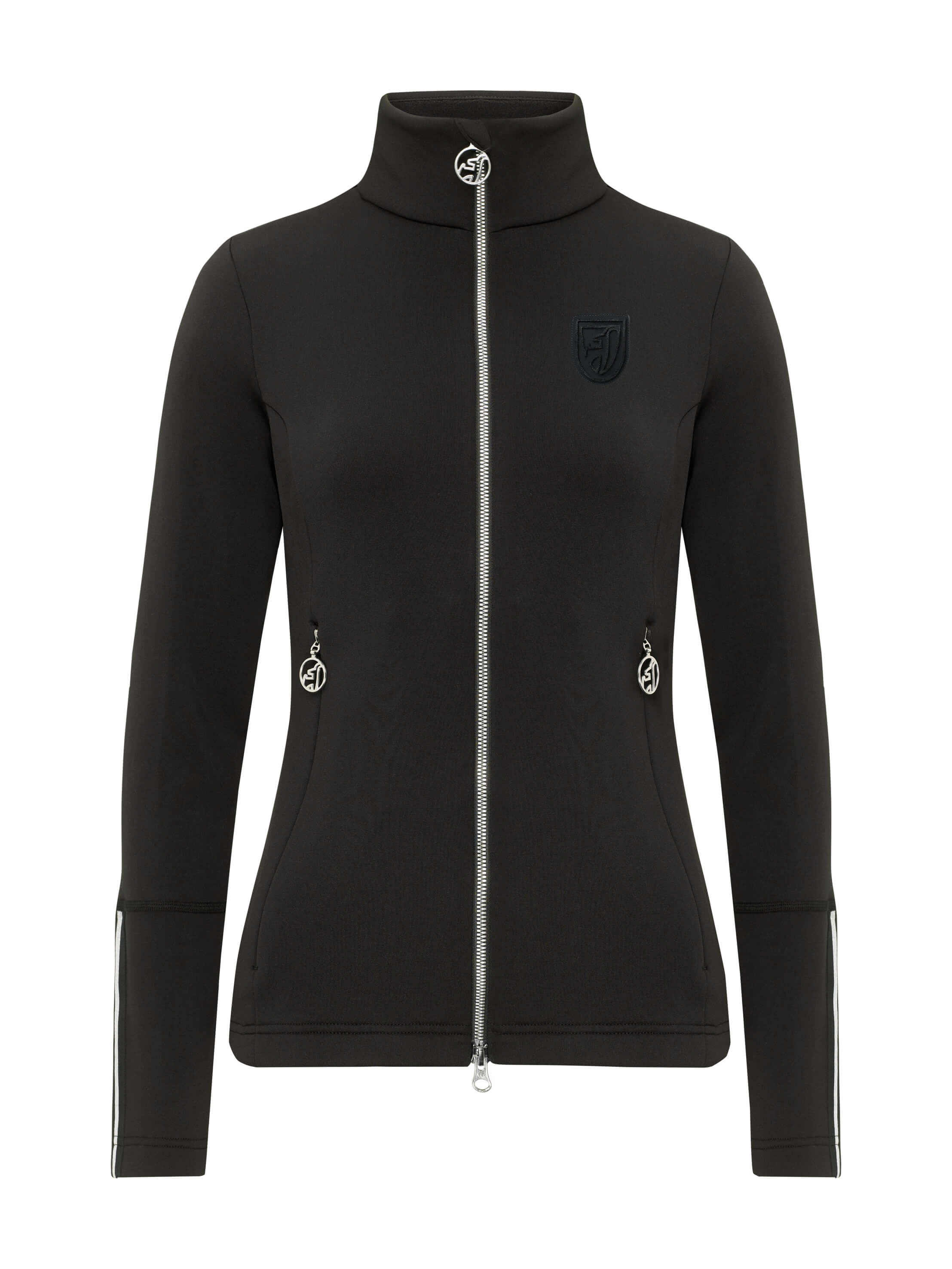 La couche intermédiaire pour femmes KATHI est fabriquée en Power Stretch italien. Ce tissu élastique et à séchage rapide conserve la chaleur tout en évacuant efficacement l'humidité. Le devant est équipé d'une fermeture à glissière miroir YKK® bidirectionnelle METALUXE®, pratique et élégante, et les poches latérales sont solidement fermées par des fermetures à glissière dissimulées. Des bandes argentées aux extrémités des manches ajoutent une touche de luxe à cette veste légère.