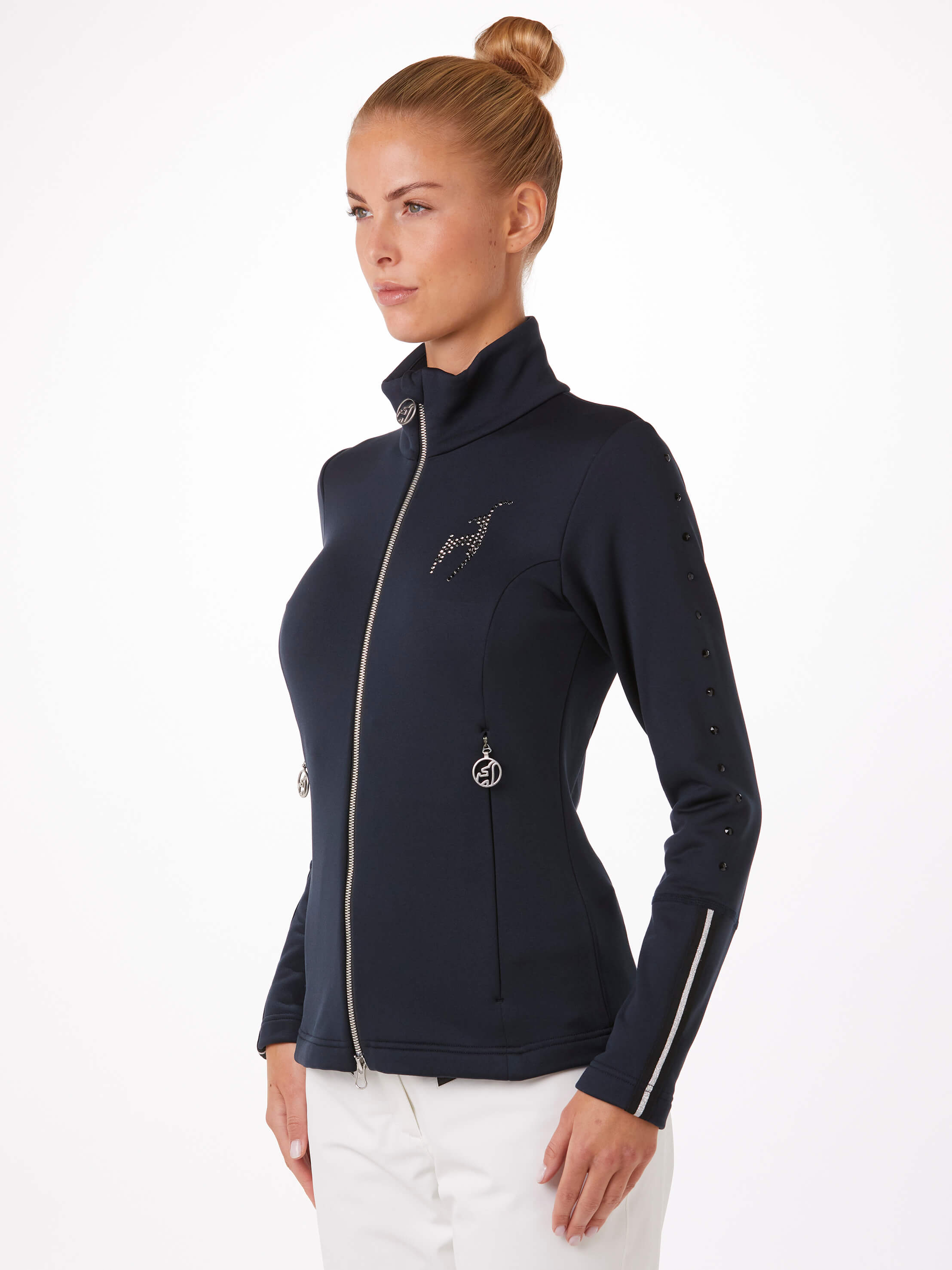 Ornée de cristaux Swarovski® - avec le logo gams sur la poitrine et des ornements le long des manches - la couche intermédiaire pour femmes KATHI SPECIAL est fabriquée dans un tissu italien Power Stretch d'une qualité exceptionnelle. Ce tissu élastique et à séchage rapide conserve la chaleur tout en évacuant efficacement l'humidité. Le devant est équipé d'une fermeture à glissière miroir YKK bidirectionnelle METALUXE®, à la fois pratique et élégante, et les poches latérales sont fermées par des fermetures à glissière sans couture. Les bandes argentées aux extrémités des manches ajoutent une touche de luxe supplémentaire à cette veste légère.