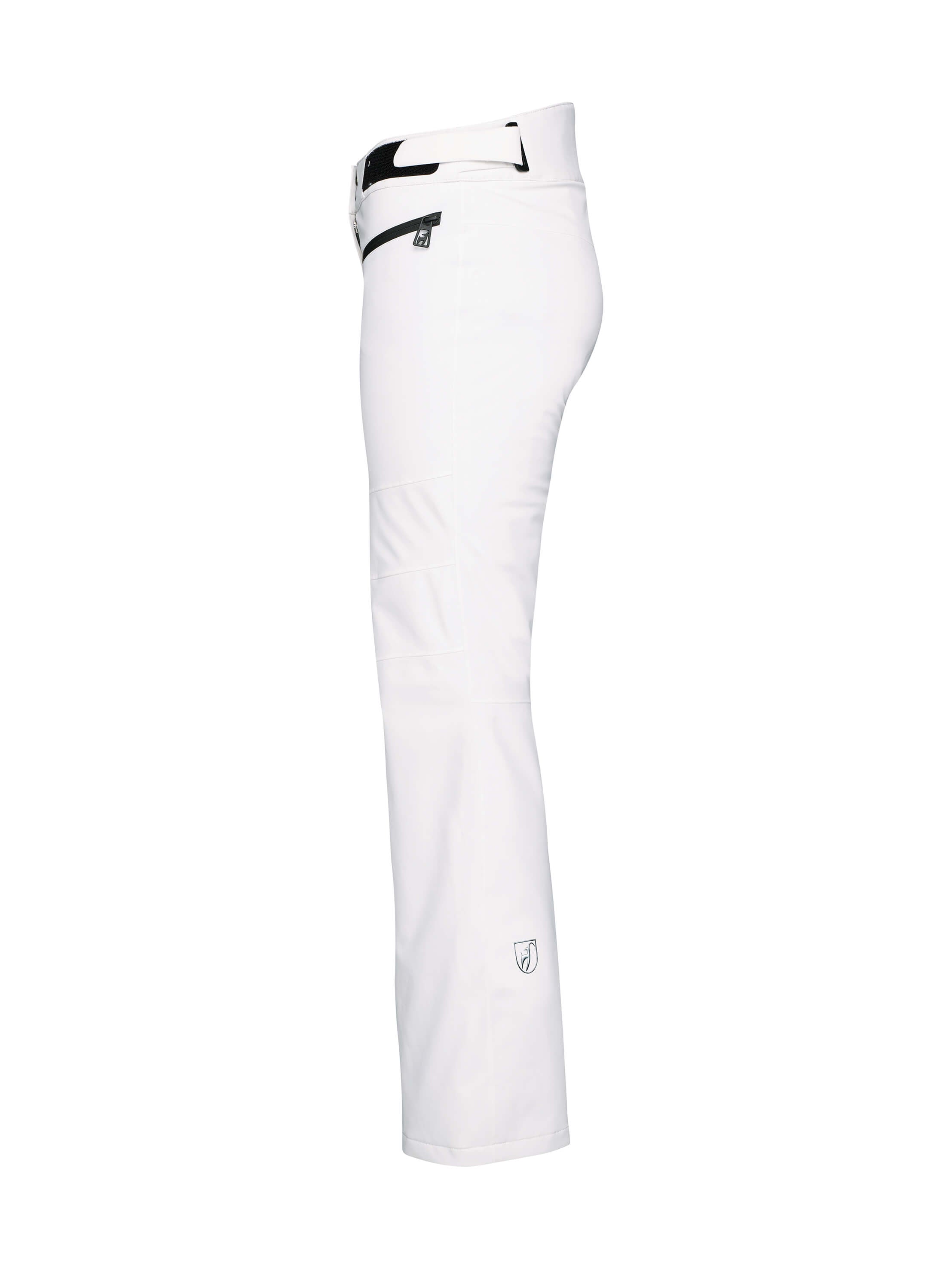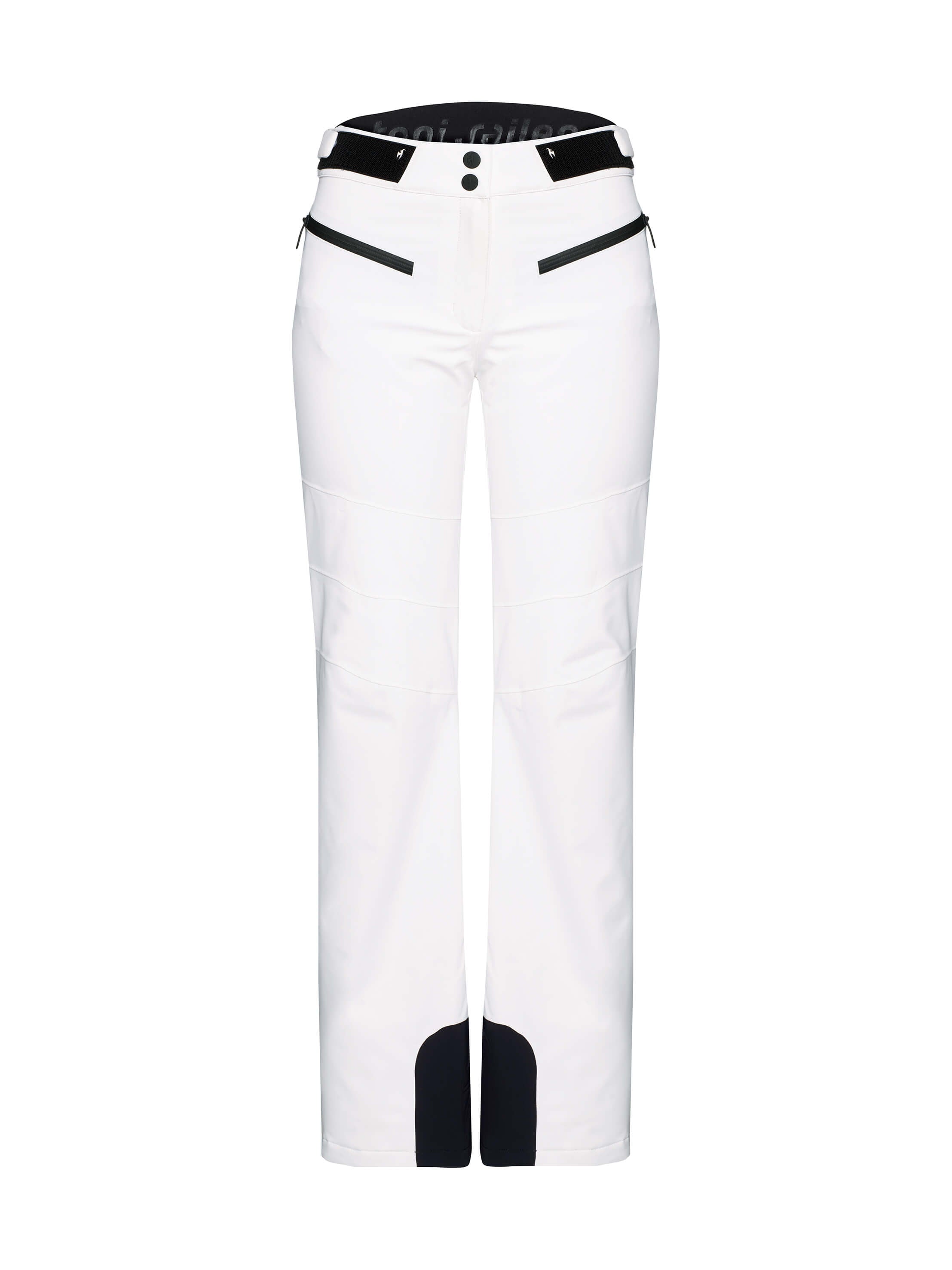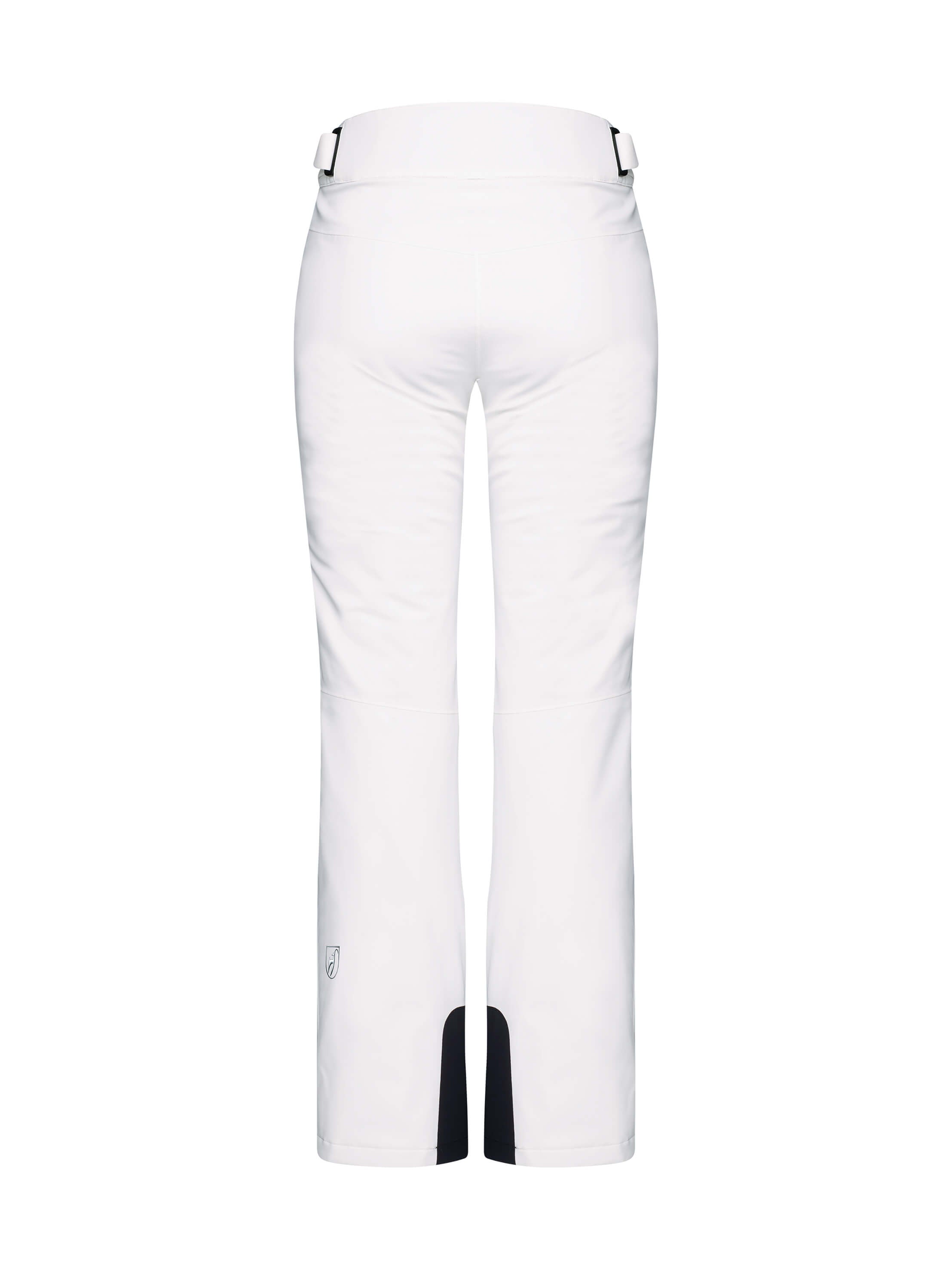 I pantaloni da sci da donna AMIS, tecnici e completamente impermeabili, impressionano per la vestibilità perfetta e la massima libertà di movimento. Il Premium 4-way Stretch giapponese si estende facilmente in tutte le direzioni, così come la membrana PU che protegge ulteriormente dall’umidità. La vita alta sul retro mantiene i reni ben al caldo, mentre le cerniere YKK® AquaGuard® impermeabilizzano perfettamente le due tasche. I dettagli raffinati includono il logo Gams Toni Sailer in rilievo sulla protezione da taglio.