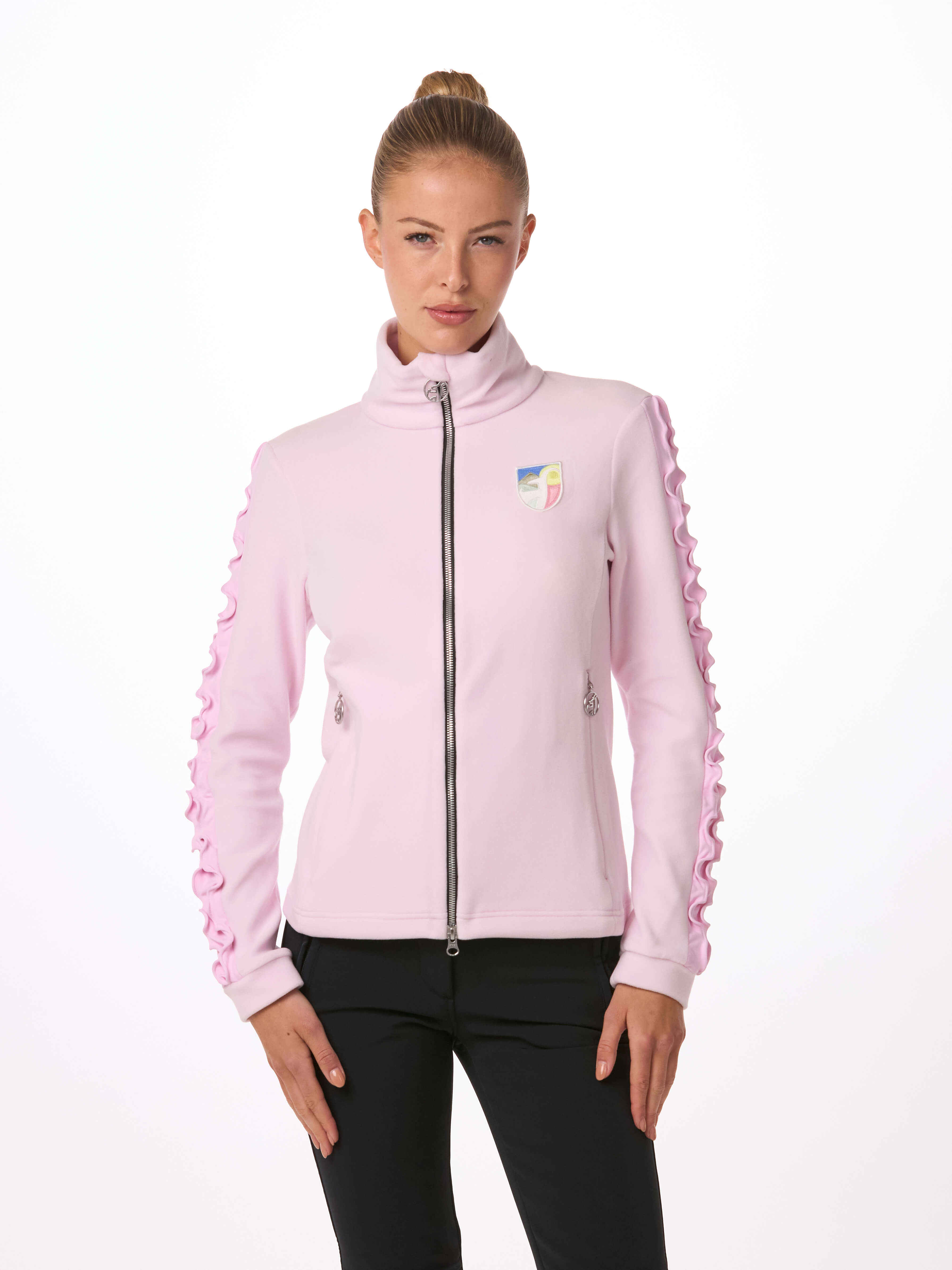 Il mid layer CARINNE di Toni Sailer unisce dettagli arricciati femminili sulle maniche con patch ricamati moderni, raggiungendo l’equilibrio perfetto tra stile e funzionalità. Offre calore e comfort affidabili, risultando ideale sia sulle piste che in città.
