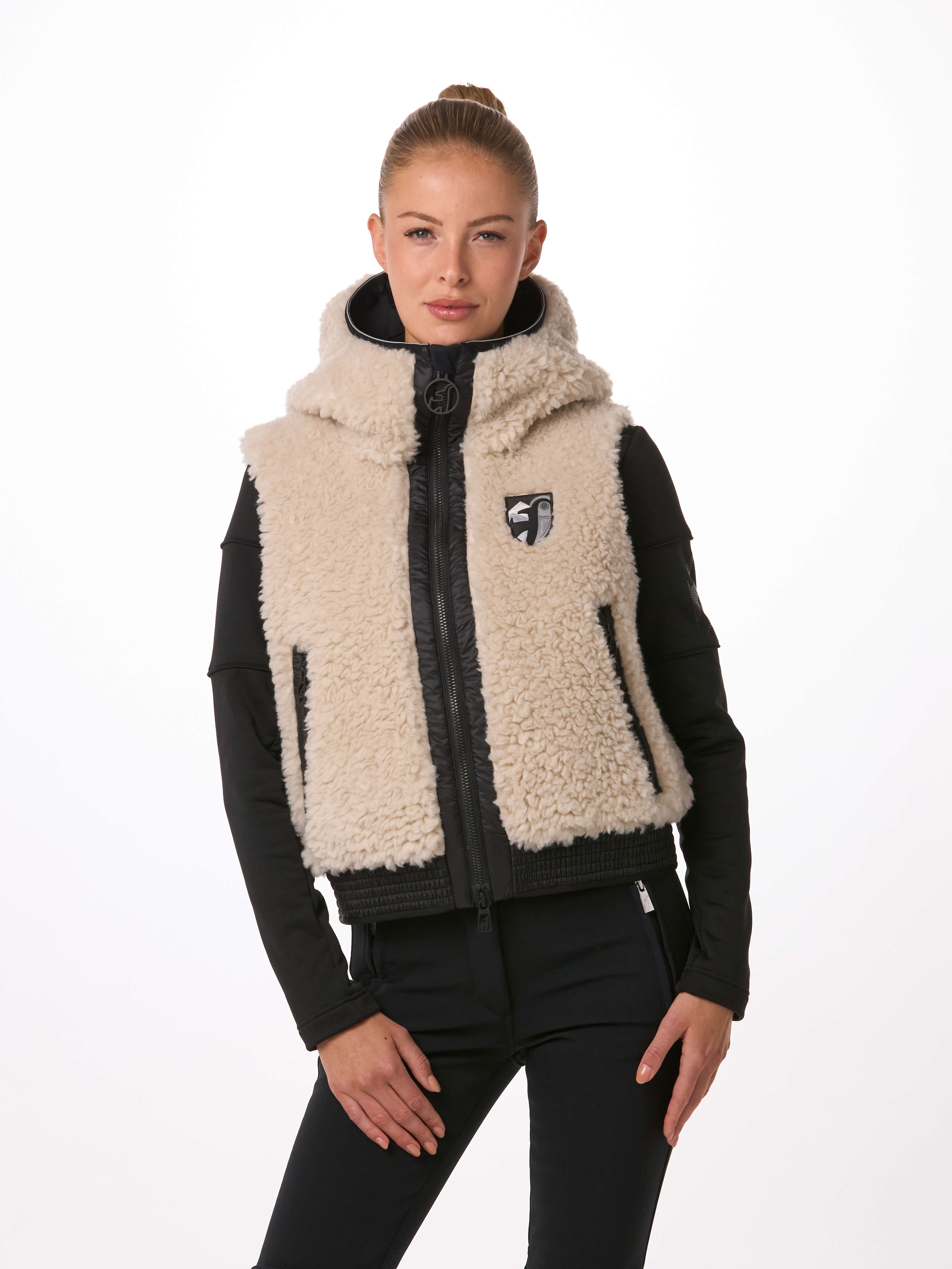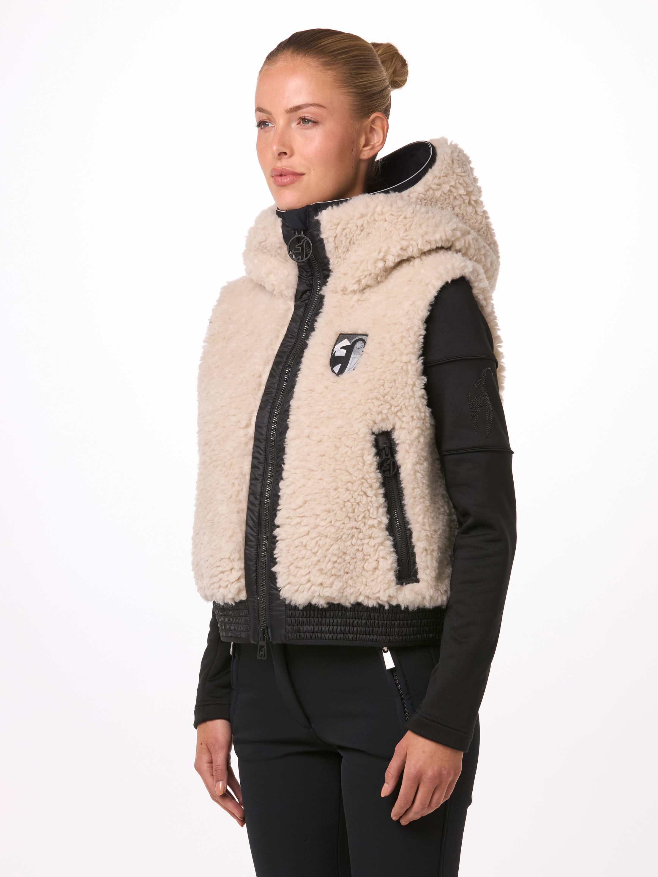 Il gilet da donna JETTI di Toni Sailer è versatile – perfetto per l’après-ski, per lo stile urbano o da indossare sopra una tuta. Il tessuto teddy riciclato ad alta densità dona un look alla moda, mentre il softshell assicura una vestibilità eccellente. Grazie alla membrana interna in PU, il gilet è traspirante, antivento e impermeabile. Le cerniere YKK® METALUXE® sono il dettaglio ideale.