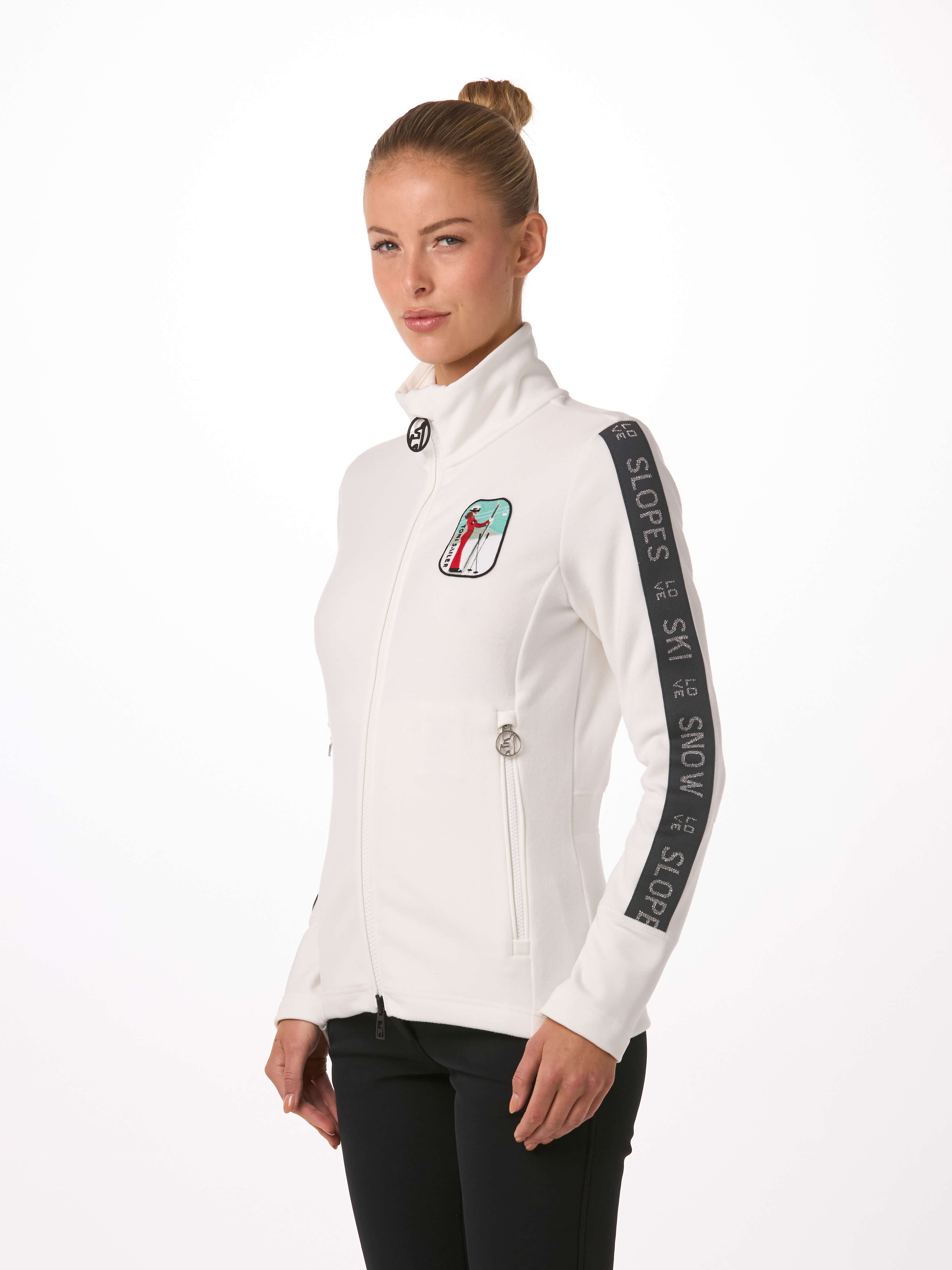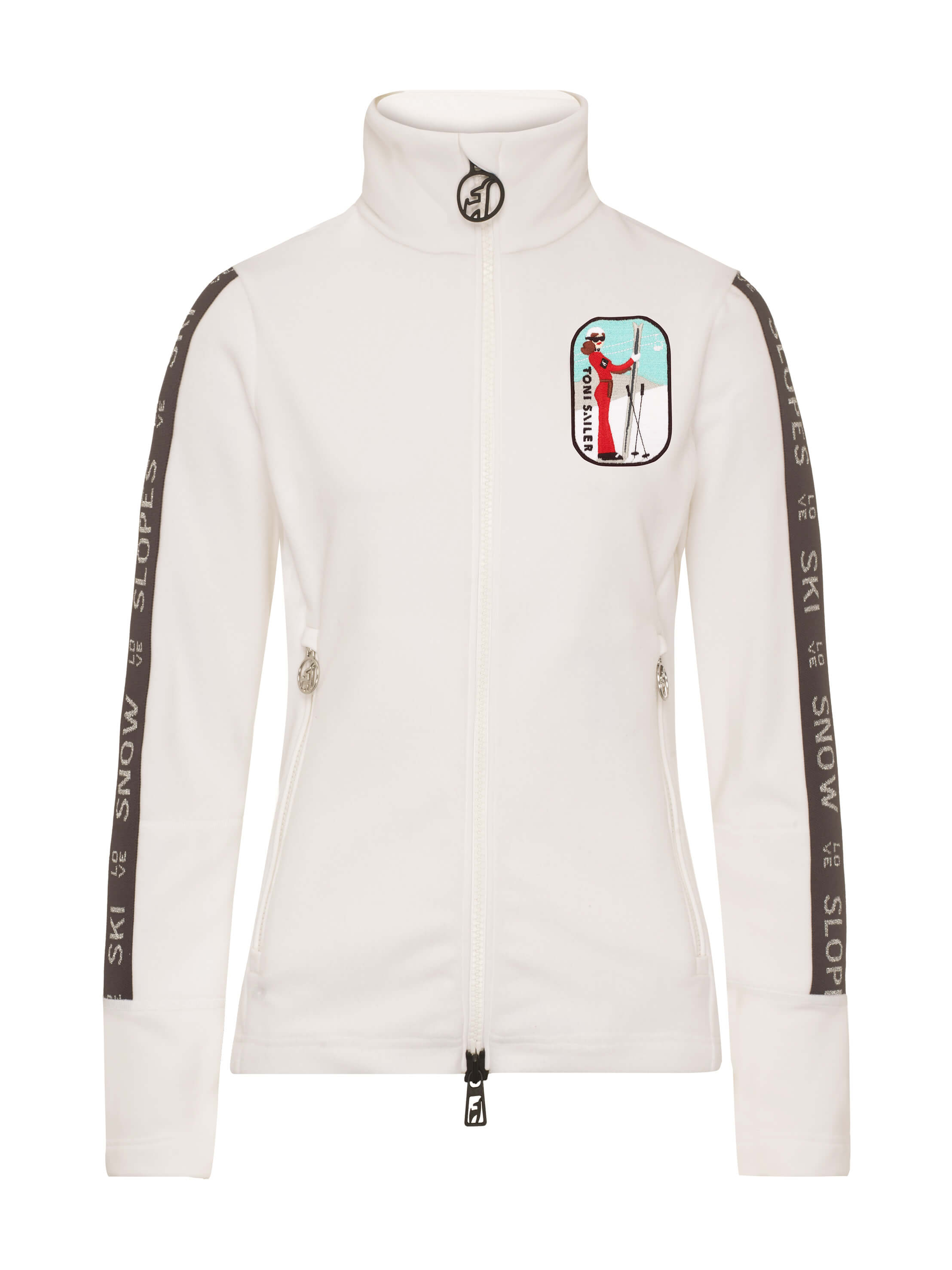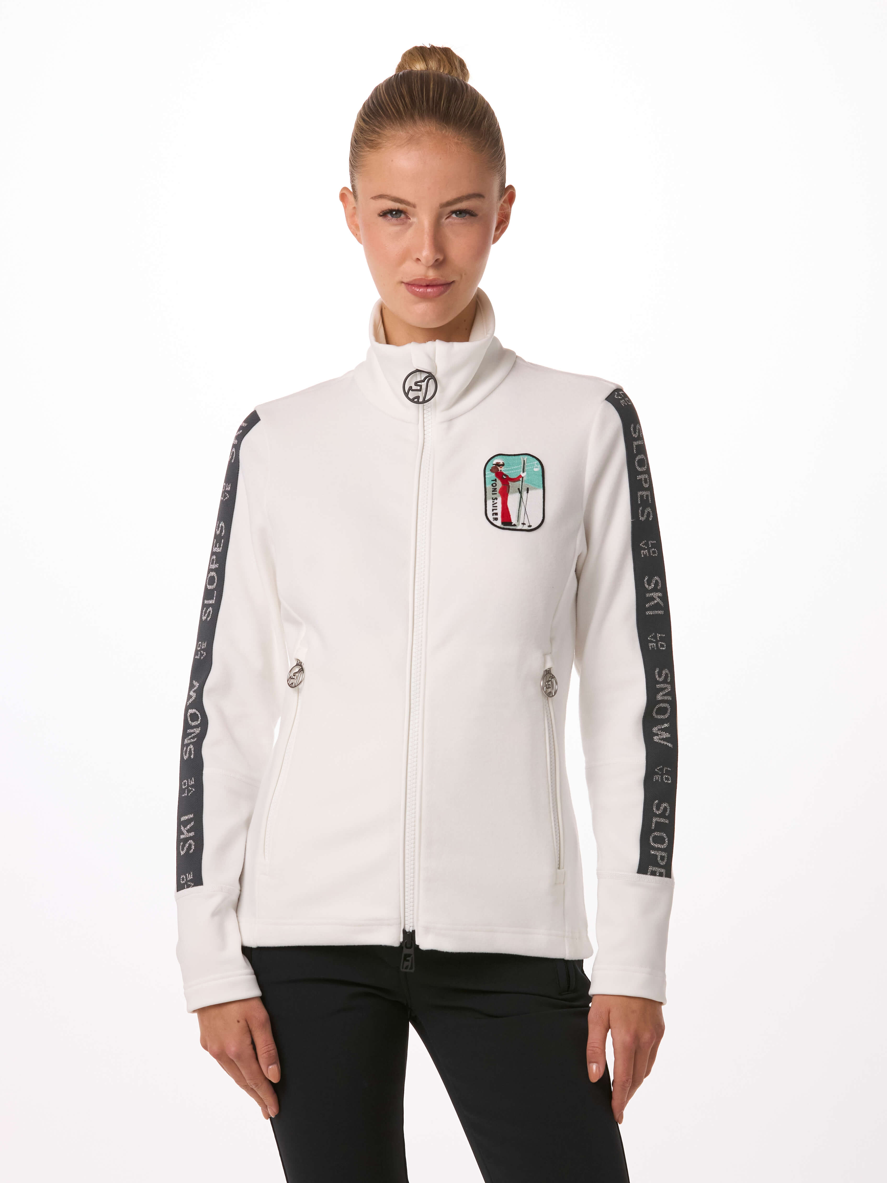 Mode trifft Funktion – Der Damen Mid Layer MANU zeigt farbenfrohe Details mit verschiedenen Stickerei-Patches auf der Brust, die von der Toni Sailer 20-Jahre-ALPES-Serie inspiriert sind. Die gestrickten Tapes mit Lurex-Schriftzügen machen die MANU so besonders. Sie bietet 100 % Bewegungsfreiheit und die Wärme, die Sie an kalten Wintertagen benötigen.